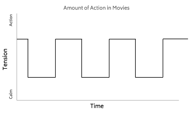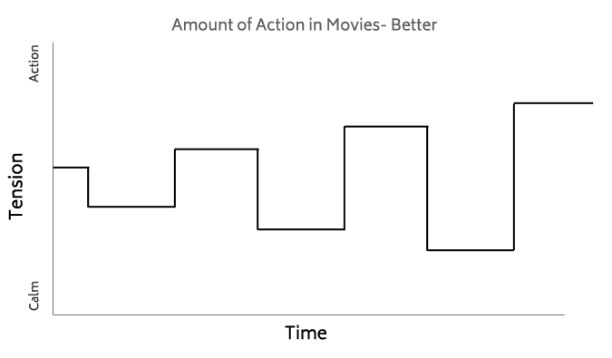 One thing that films have become very good at is switching between periods of high action adrenalin and calm. The reason for this is as humans we get saturated with similar stimuli and start to block it out. Knowing when to switch is a real art form, the feeling is also exaggerated by the contrast between the two.