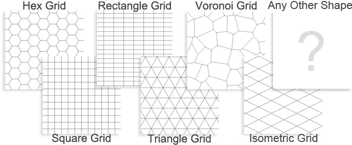 - Doesn’t have to be square grids, will do any tessellating and non-tessellating world (hex, rectangle, rhombus, triangular, isometric, voronoi etc).